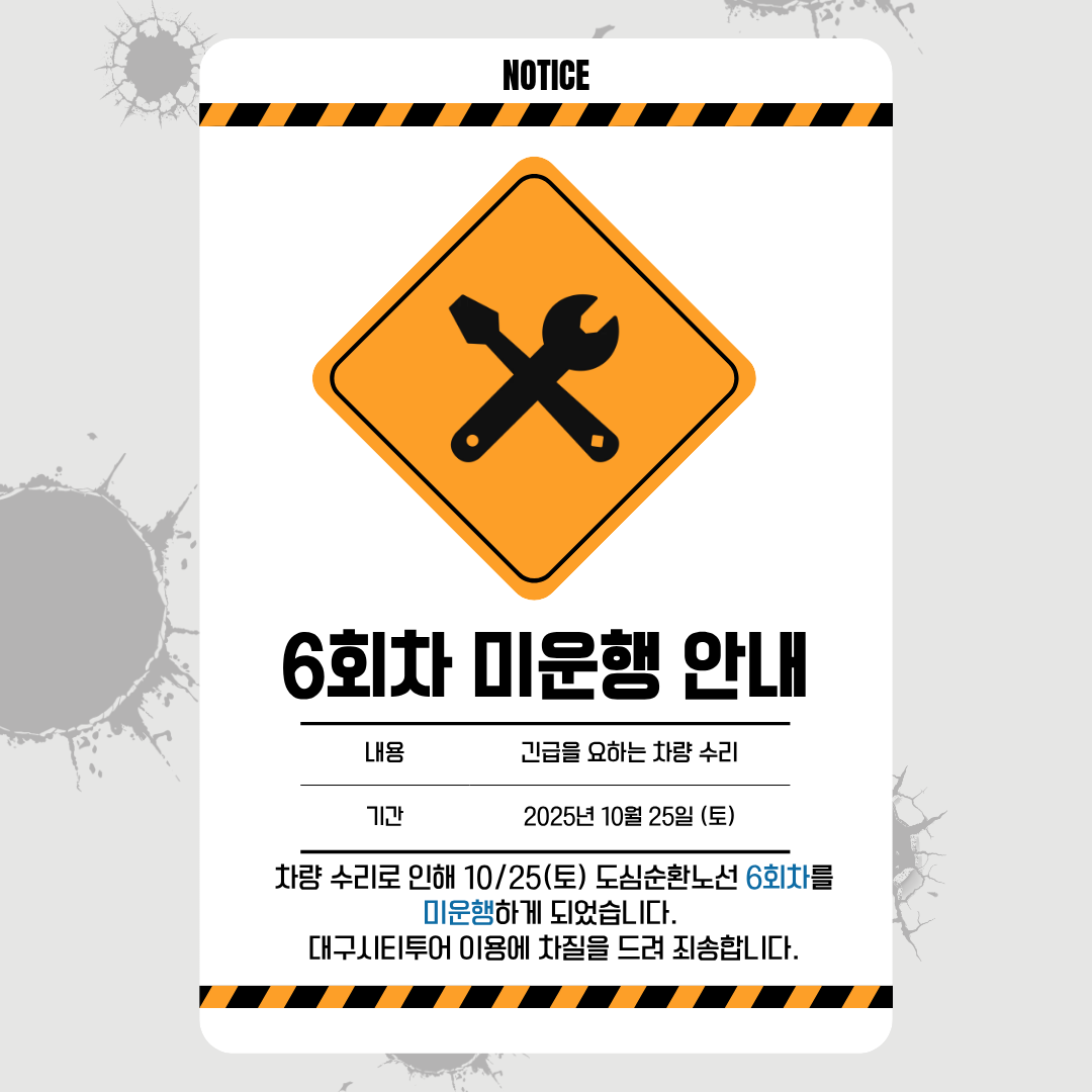 안녕하세요대구시티투어를 이용해주셔서 감사합니다.대구시티투어 도심순환노선 6회 운행을 부득이한 사정(긴급을 요하는 버스 차량 수리)으로 하지 못하게 되었습니다.
