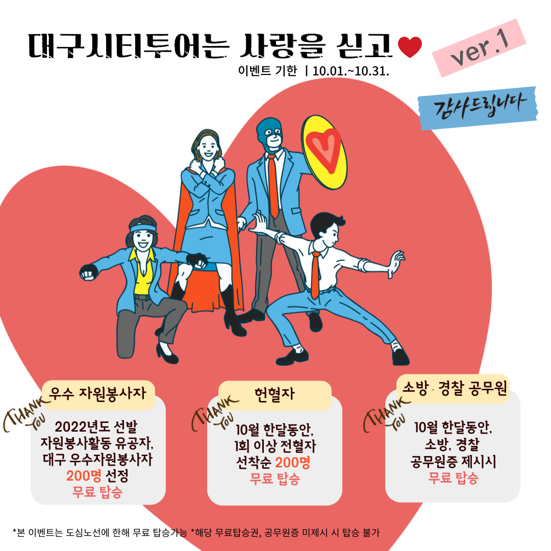 대구시티투어에서는 10월 한달동안 감사한 분들을 대상으로 '대구시티투어는 사랑을 싣고♥' 이벤트를 진행합니다^^