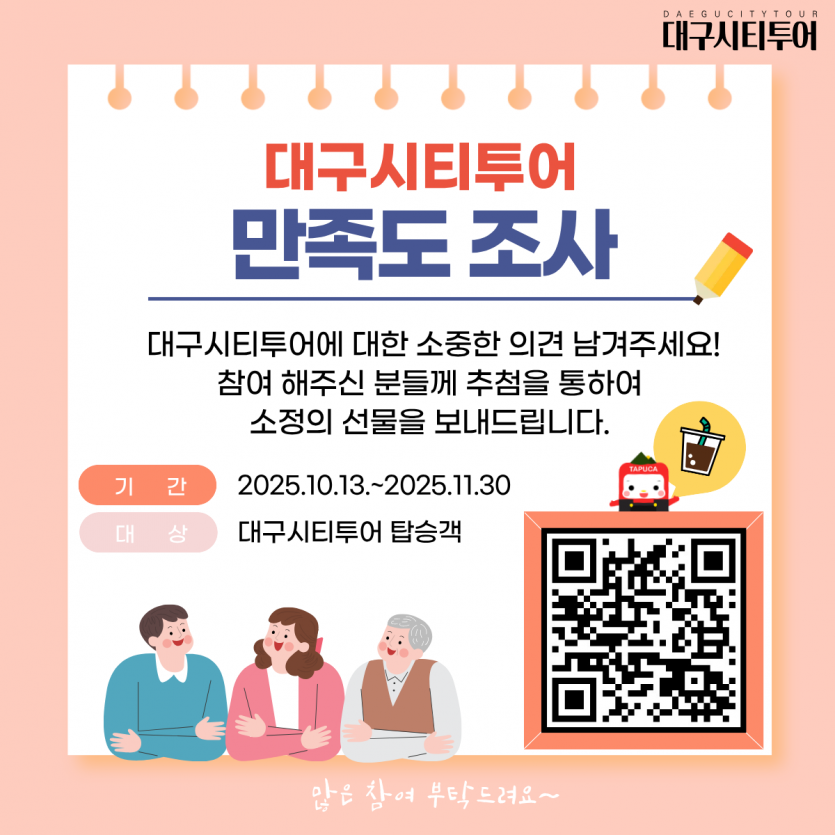 10월 13일~11월 30일까지 대구시티투어 만족도 조사를 진행하오니 많이 참여부탁드립니다.