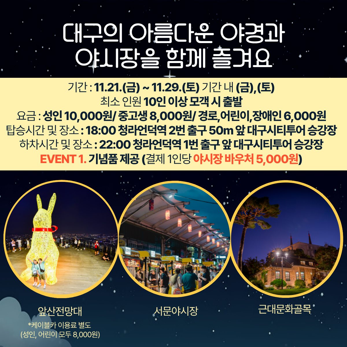 - 투어코스 : 18:00 청라언덕역 2번 출구 50m 앞 대구시티투어 승강장 (출발) → 앞산전망대 → 서문야시장 → 근대문화골목 → 22:00 청라언덕역 1번 출구 앞 대구시티투어 승강장 (도착)